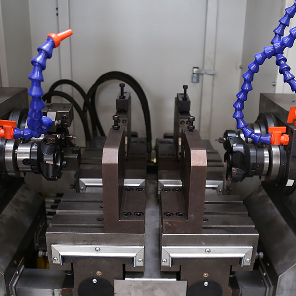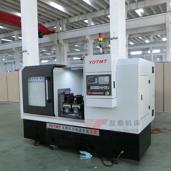 ZK8206-600铣端面打中心孔机床为平床身卧式三轴结构,采用三套数控进给工作台,两套对置的双主轴动力头,铣削主轴上装有BT50标准接口的铣刀盘,钻孔主轴上装有BT40标准的钻刀柄,钻孔主轴上还可以选装外圆套车刀盘用于钻中心孔的同时在工件轴端套车一段外圆,用于后序车床加工时夹持,可省去车床调头加工的一道工序。采用两套自定心液压虎钳,用于装夹工件,夹具可快速的根据工件长短调整夹持位置。